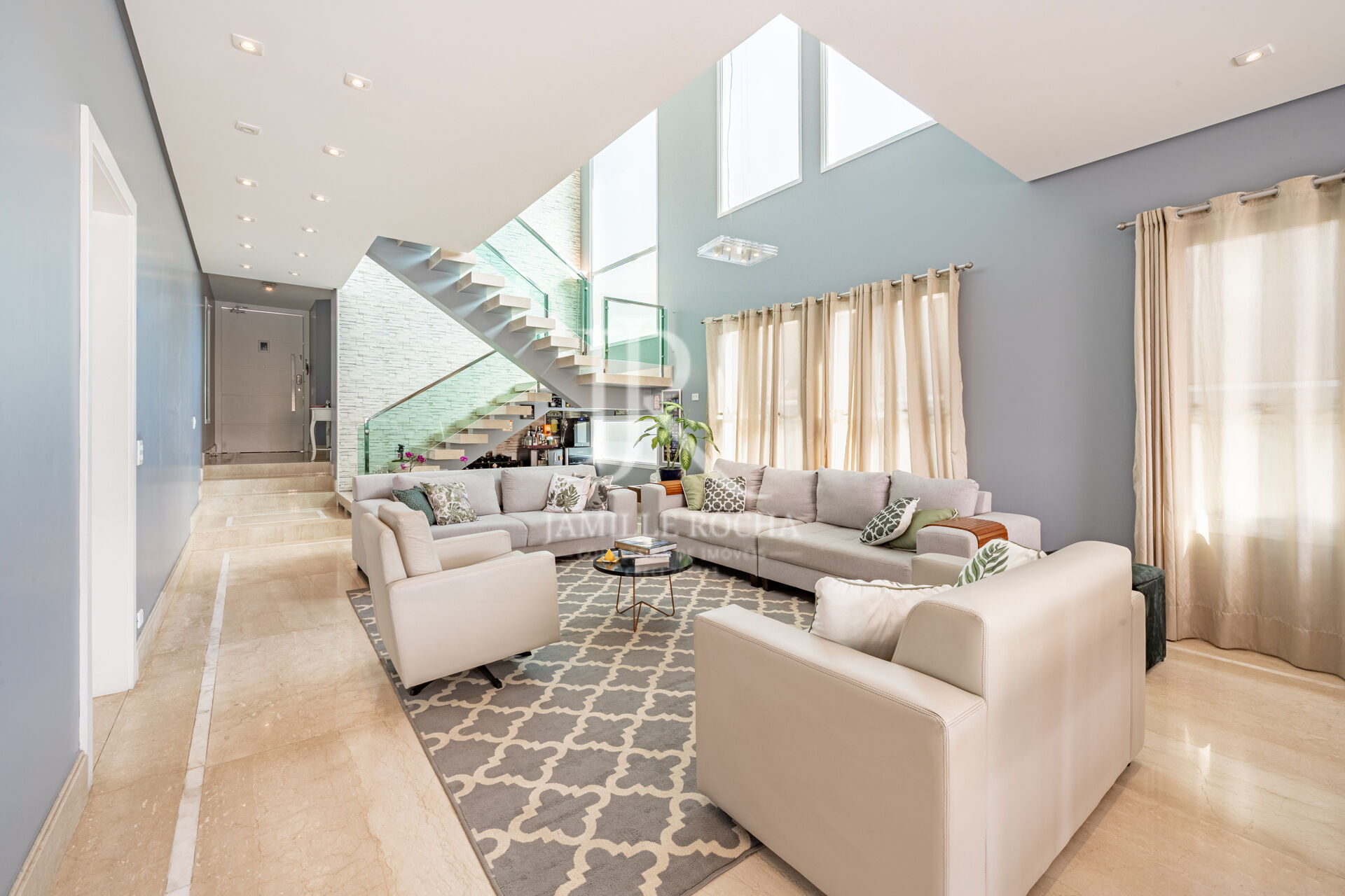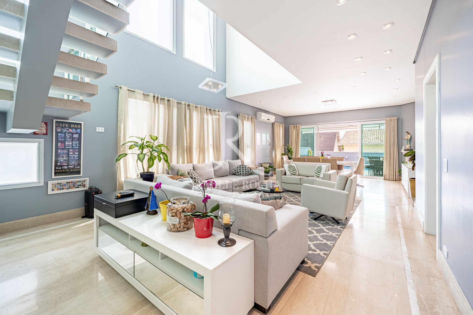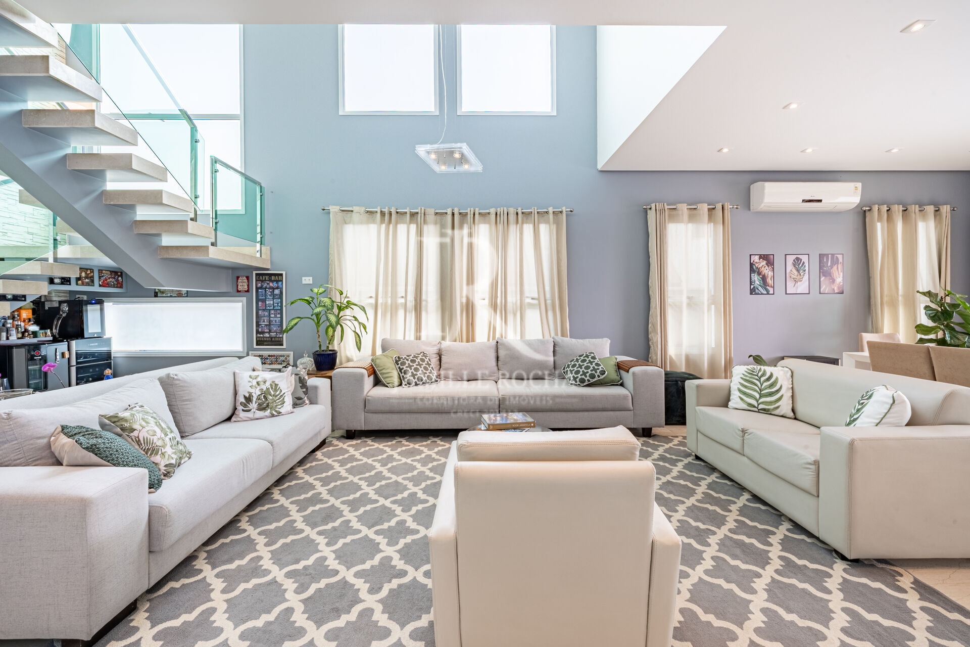 Living amplo e integrado, com pé-direito alto e excelente iluminação natural